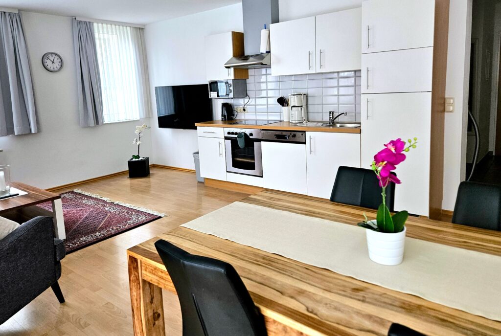 Die perfekte Ferienwohnung für die kleine Familie: Bis zu 5 Personen finden eine komfortable, große Küche, Balkon/Terrasse oder Zugang zum Garten, 1 Schlafzimmer und 1 Schlafsofa im Wohnzimmer.